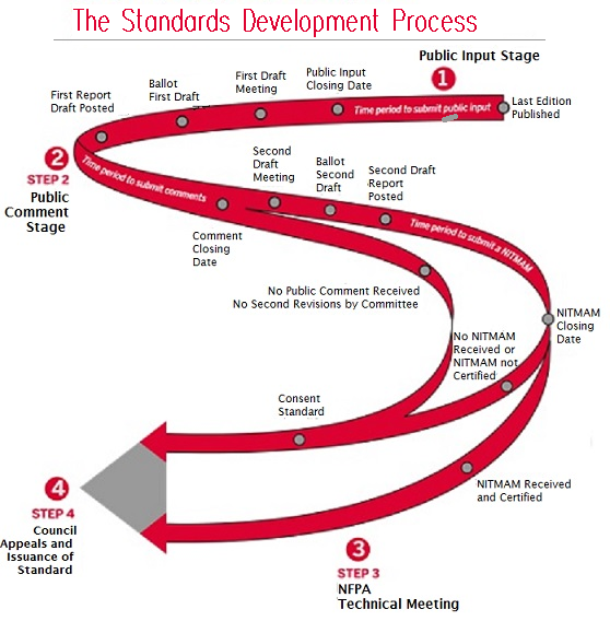 But, before a proposed code change becomes either a "Consent Standard" or NITMAM, it faces the rousing STEP TWO: The PUBLIC COMMENT Stage. All proposed changes submitted by any interested party anywhere in the world (if found worthwhile by an NFPA panel) has been assembled into a FIRST DRAFT. It's distributed far and wide and comments are welcomed. Emotions can run high in some of these Public Comments — after all this is what we do for a living — so the calls to reject recommended changes or to reconsider overlooked changes are deeply felt. No new proposed changes are allowed during the Public Comment period.