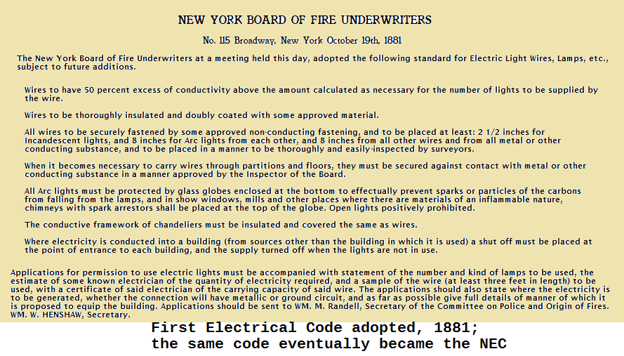 It's been this way from the beginning. In 1881 (less than 3 years after Edison patented his light bulb and a year before his lower Manhattan inauguration of the nation's first electrical grid), a small cadre of electricians met in New York City and, together, fashioned the first electrical code. The NFPA took this tiny code, eventually renamed it the National Electrical Code (NFPA 70), and expanded it massively over the course of more than 50 revised editions. For decades, the revision process followed the American National Standards guidelines that require: